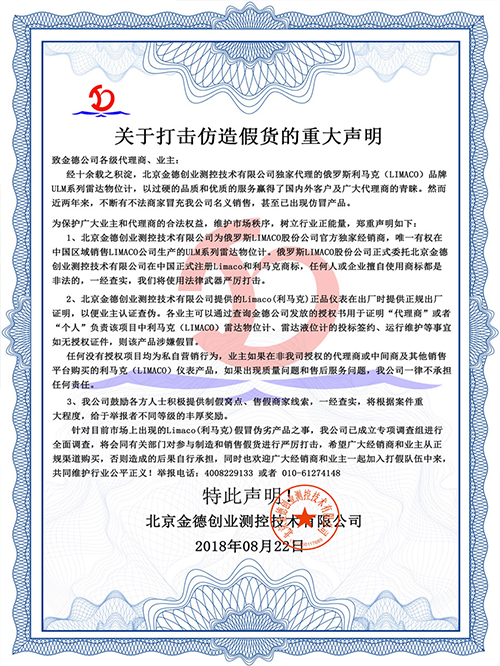 北京金德創(chuàng)業(yè)測(cè)控技術(shù)有限公司提供的Limaco(利馬克)正品儀表在出廠時(shí)提供正規(guī)出廠證明,以便業(yè)主認(rèn)證查偽。同時(shí)各業(yè)主可以通過查詢金德公司發(fā)放的授權(quán)書用于證明“代理商”或者“個(gè)人”負(fù)責(zé)該項(xiàng)目中利馬克(LIMACO)雷達(dá)物位計(jì)、雷達(dá)液位計(jì)的投標(biāo)簽約、運(yùn)行維護(hù)等事宜。如無授權(quán)證件,則該產(chǎn)品涉嫌假冒。