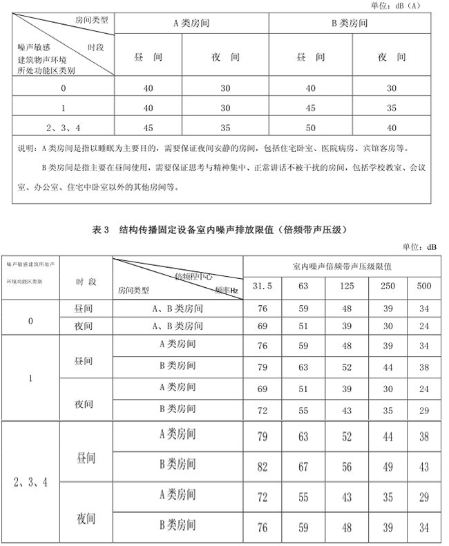 表2 結(jié)構(gòu)傳播固定設(shè)備室內(nèi)噪聲排放限值(等效聲級)